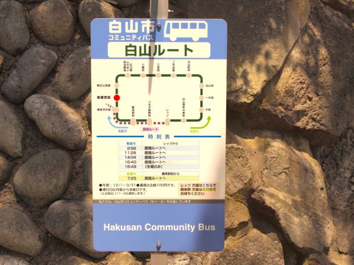 金劍宮へは鶴来駅から白山市のコミュニティバス(100円)で2ストップで「金劍宮前」でも行けますが本数が少ないです。