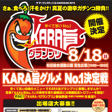 「サマーフェスティバルHAKUSAN2019」というお祭りの中で開催される、激辛料理のグランプリを決める大会です。全国や石川の辛くてウマい有名店が、自慢料理の売り上げをリアルに競います!