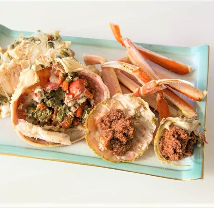 石川県産ズワイガニの雄は「加能ガニ」、雌は「香箱ガニ」と呼ばれブランド化されています。刺身でも茹でても焼いても美味しい蟹を求めて、観光客のみならず地元民も競って飲食店を予約するのがカニの解禁日直後(11/6)。香箱蟹は「カニ面」という金沢おでんの具に使われることでも有名です。