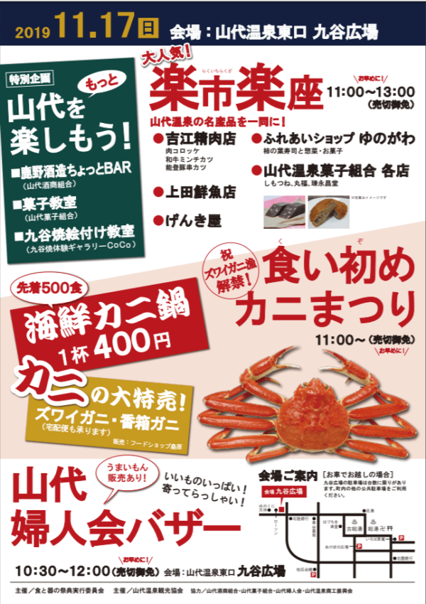 海鮮カニ鍋や、山代温泉の名産品を一同に味わえるイベント。「食と器の祭典」との同時開催。