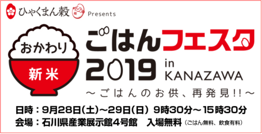 石川県産の新米を無料で食べられるイベント。ご飯以外のものは有料で、各種ご飯の”お供”ととれたての新米を味わうことができる。