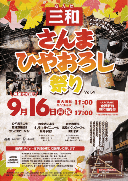 ひやおろしと旬のサンマと一緒に楽しめるイベント。生ビールほかサンマ以外の飲食メニュー、かき氷や風船すくいなどもあり、子供連れでも楽しめる。