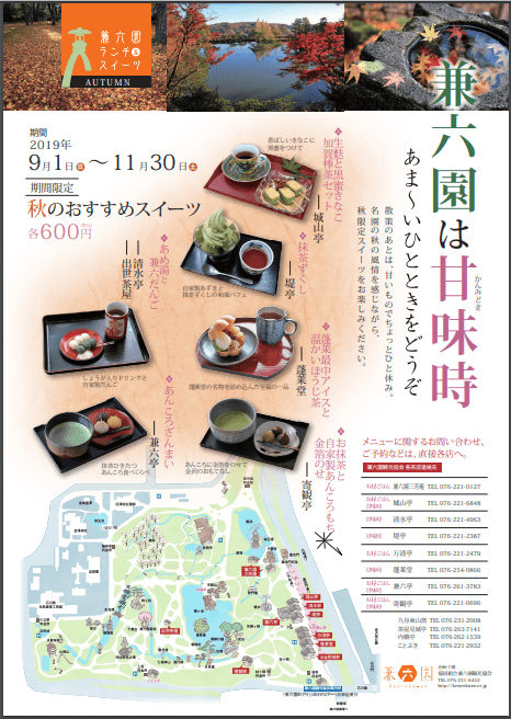 9月と言えば兼六園でも「中秋の名月鑑賞の夕べ」としてライトアップイベントなども始まるんやよ・・・けど、私はそれより食い気!日本庭園を眺めながらおいしいもの食べたくない?兼六園観光協会ではランチ&スイーツを提供する8店舗をPRしてるので、公式HPをチェックしてみてね!