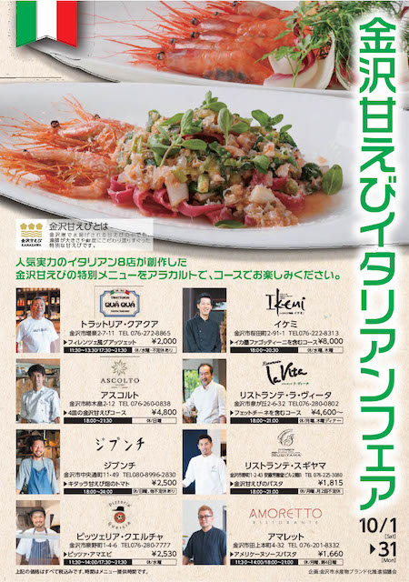 凄腕シェフ達が創作する期間限定の金沢甘えびイタリアンをコースやアラカルトでお楽しみください♪