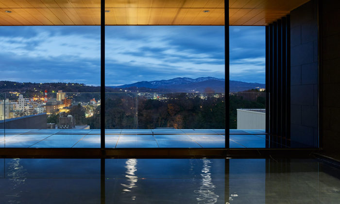 13階の大浴場からは金沢城址公園の緑とスキーリゾート「医王山」の山並みがパノラマで楽しめるようです。
