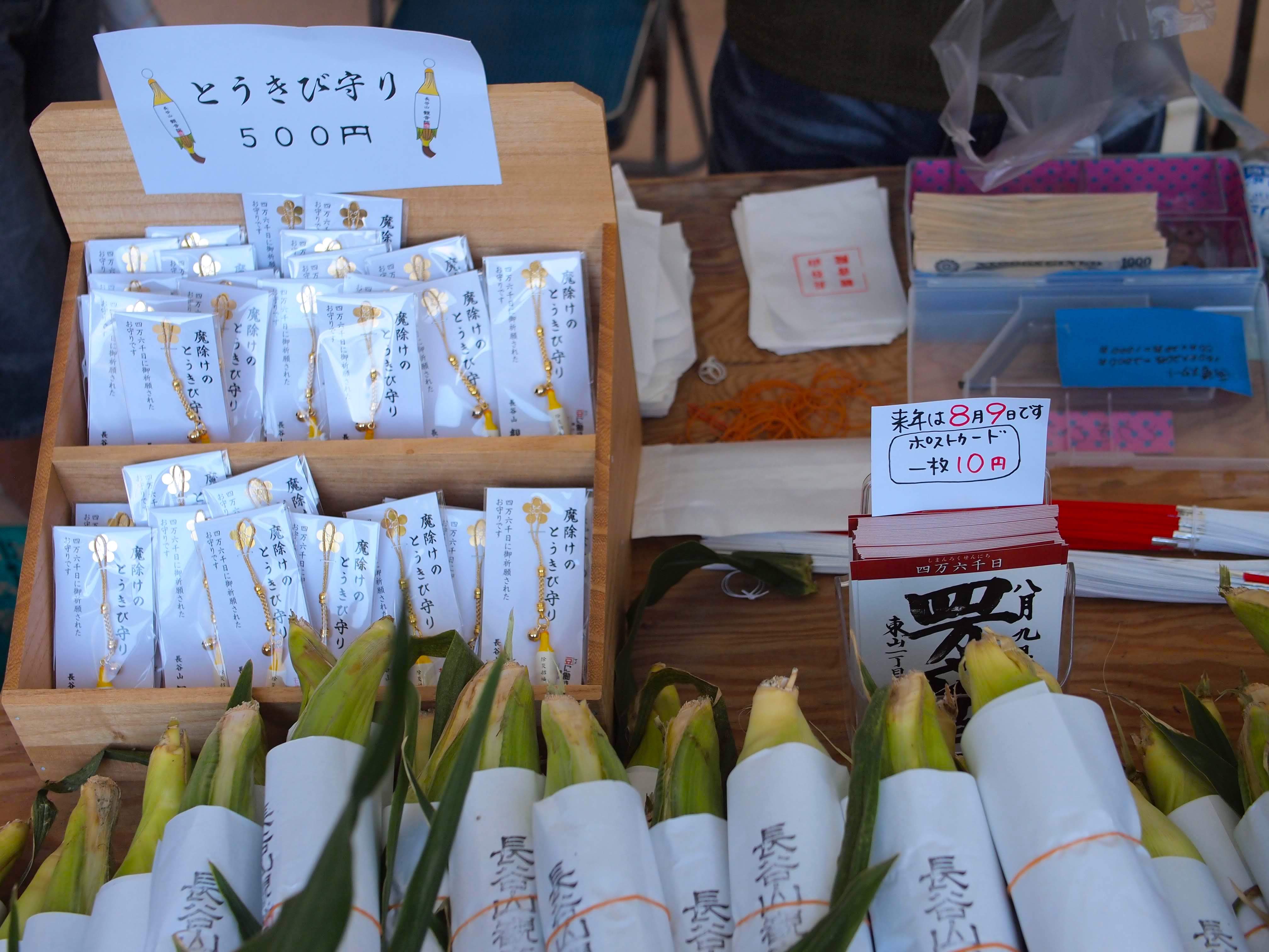 魔除けや商売繁盛の玄関用の生の「とうもろこし」は昔は「生の祈祷とうきび」(1本500円)のみでしたが、近年あまりにも早く売り切れてしまうため、近年は携帯用に「ストラップ型とうきび守り」(1つ500円)も販売されるようになっています。