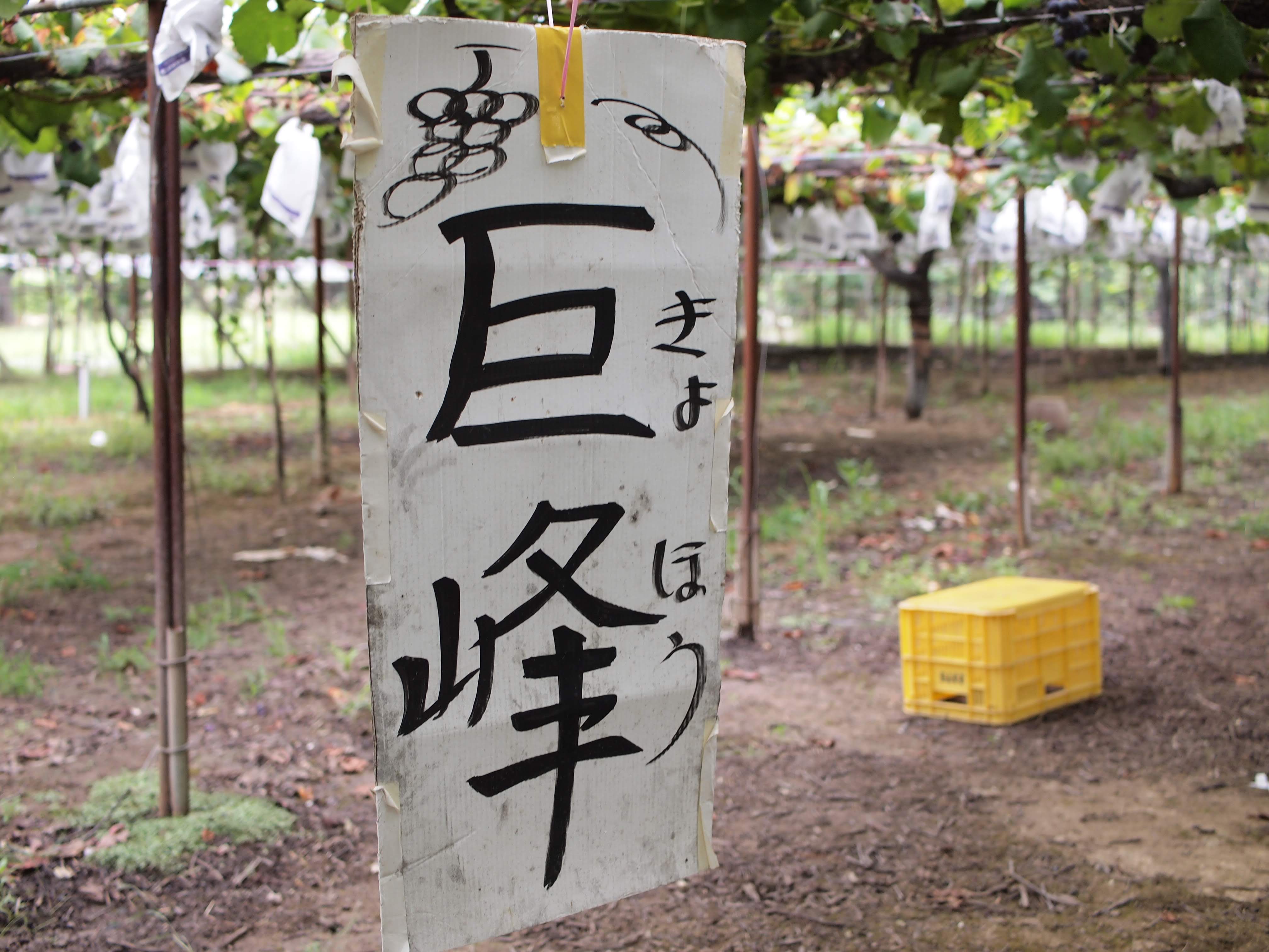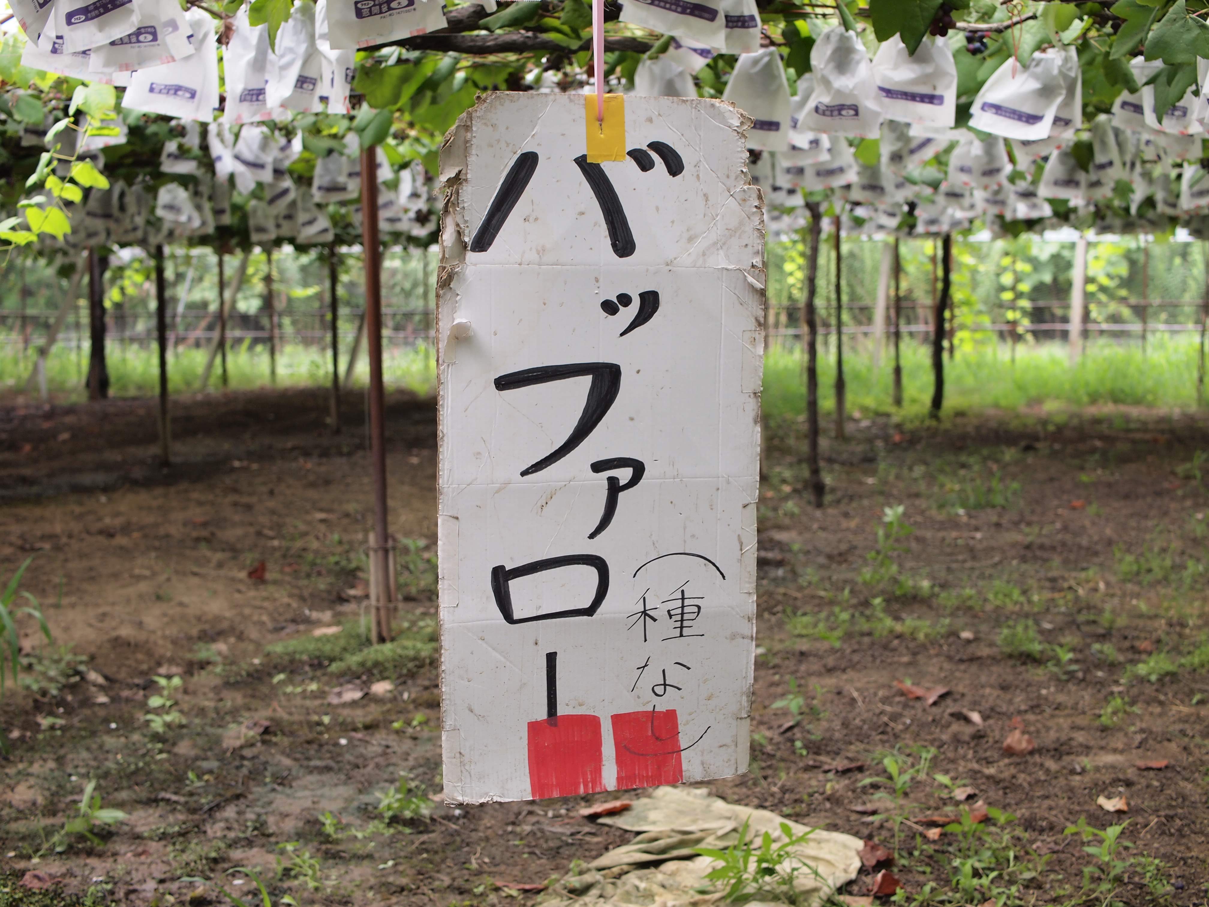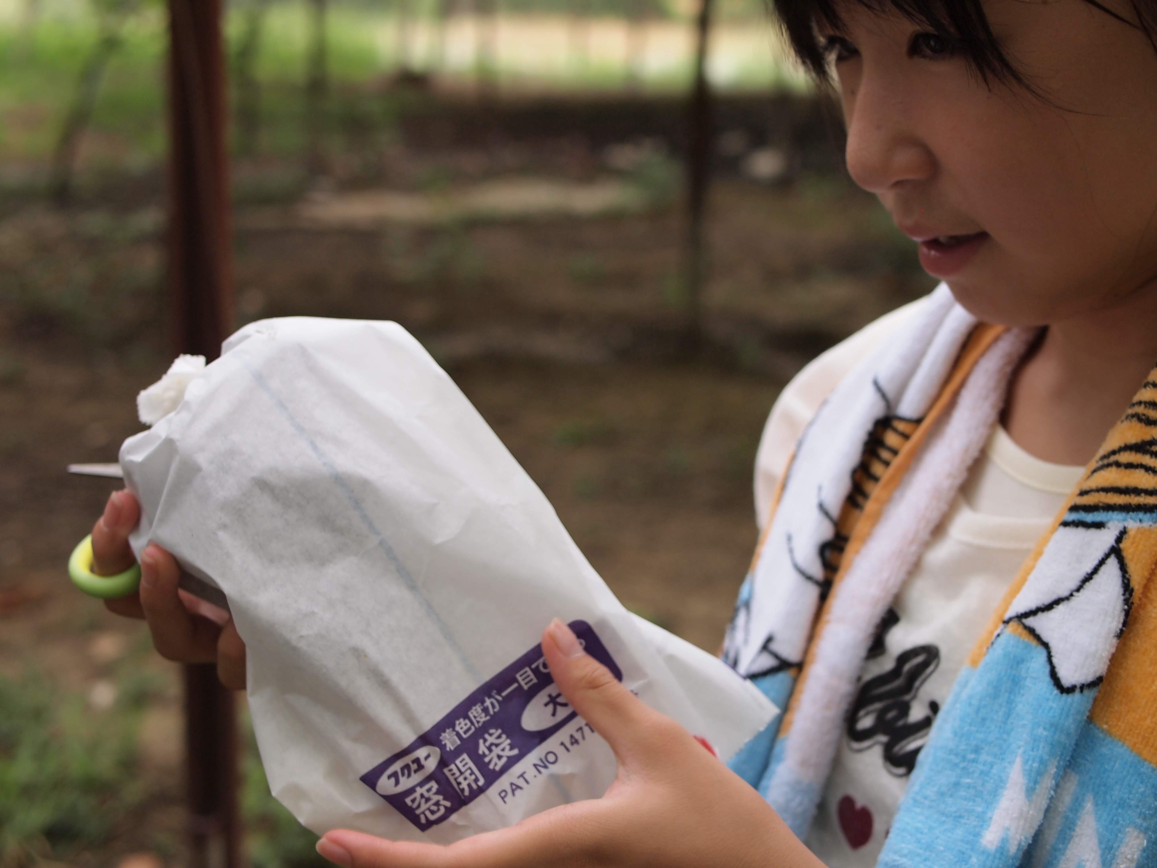 上の写真の様に食べごろのぶどうは印がついていて、白い袋が被さっています。