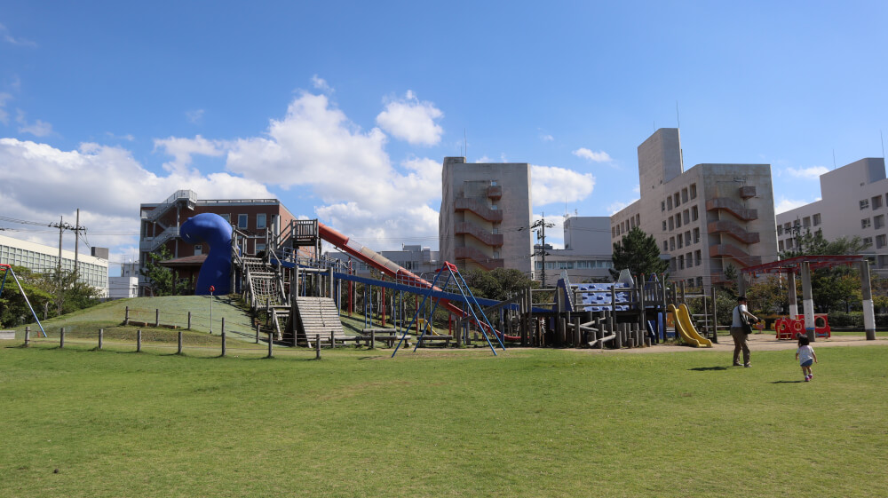【設 備】長い滑り台、アスレチック、幼児向け遊具、休憩所(屋根付き)、砂場、オムツ替え・バリアフリートイレ、水飲み場