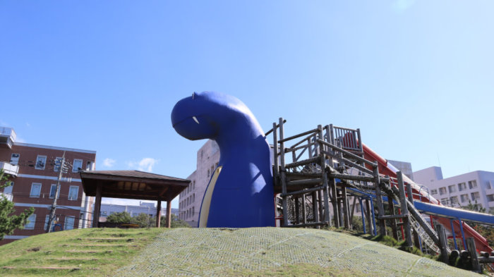 おそらく、この公園の目玉であろう遊具は「青い恐竜型の長いローラー滑り台」です。